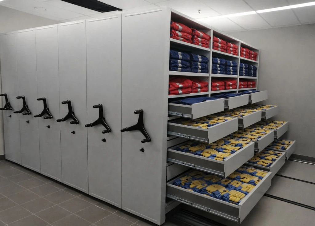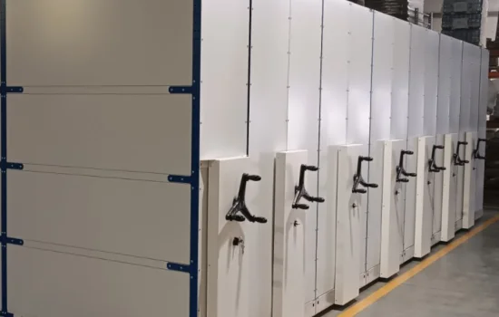 Среднегрузовые передвижные стеллажи закрывающиеся дверями жалюзи для склада, цеха или производства.