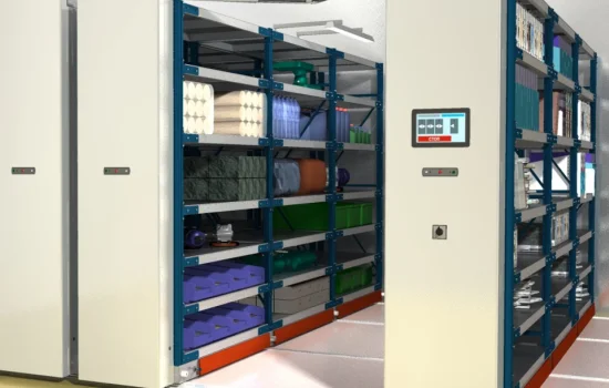 Среднегрузовые мобильные стеллажи с закрывающимися секциями для склада, цеха или производства.