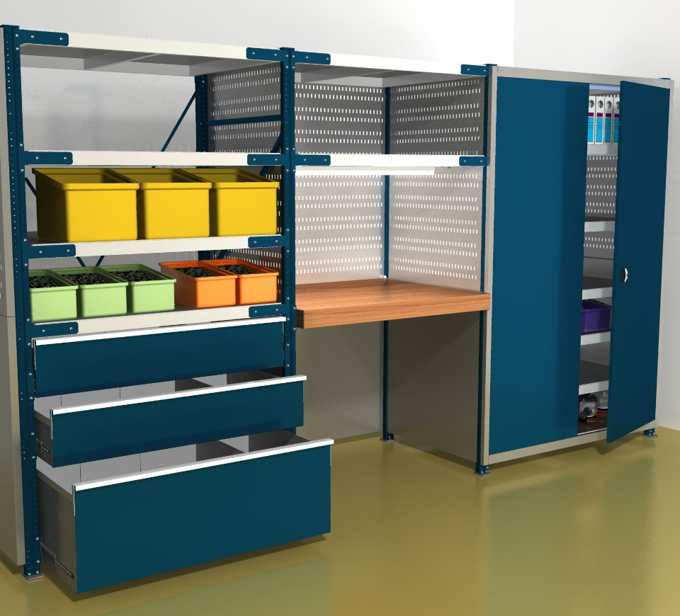 Стеллажный комплекс с рабочим местом. Может включать в себя верстаки, столы, дополнительные стойки или шкафы с ящиками или дверями.